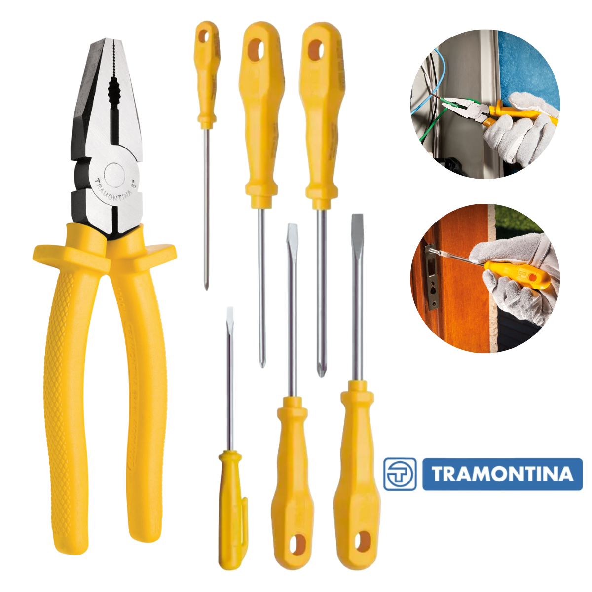 Se você quer completar seu kit de ferramentas, precisa do Kit Jogo de Chaves de Fenda Tramontina Yellow 6 Peças com um Alicate Universal Tramontina 1.000V. Um jogo que traz chaves de fenda com ponta chata, ponta cruzada, uma chave clipe, ideal para fixar em cintos e alças e que é um coringa na hora de apertar ou afrouxar parafusos e um Alicate Universal. Todos da marca mais confiável do mercado: Tramontina!